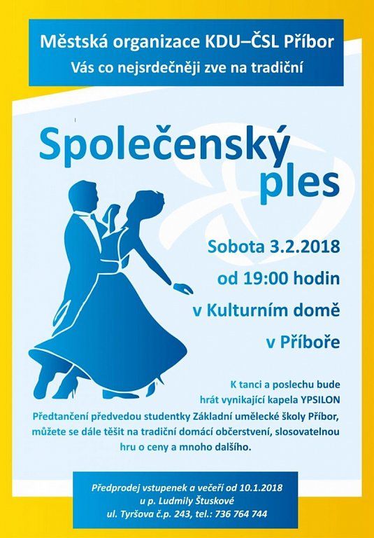 Pořádá MěO KDU - ČSL Příbor. K tanci a poslechu hraje hudba Ypsilon, předtančení tanečního oboru ZUŠ.