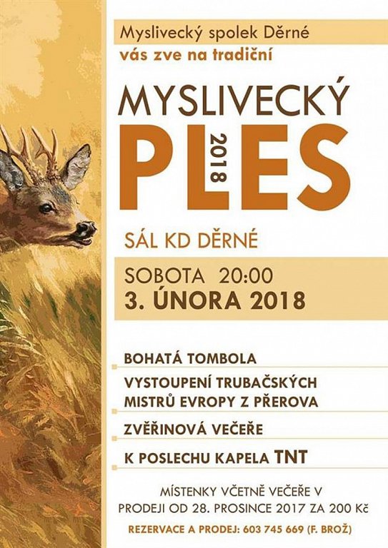 Myslivecký spolek Děrné Vás zve na tradiční Myslivecký ples. Těšit se můžete na bohatou tombolu nebo vystoupení trubačských mistrů Evropy z Přerova.