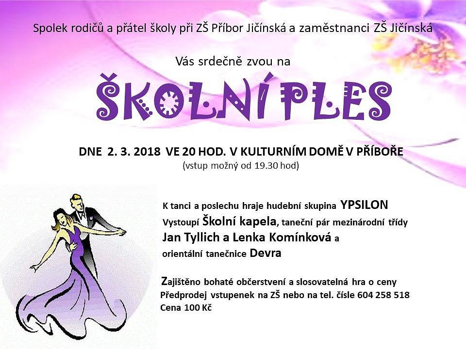 Tradiční ples Základní školy Jičínská. K tanci a poslechu zahraje skupina YPSILON. Vystoupí školní kapela, taneční pár mezinárodní třídy Jan Tyllich a Lenka Komínková a orientální tanečnice Derva. Zajištěno bohaté občerstvení a slosovatelná hra o ceny. Předprodej vstupenek ZŠ nebo na tel. čísle: 604 258 518.