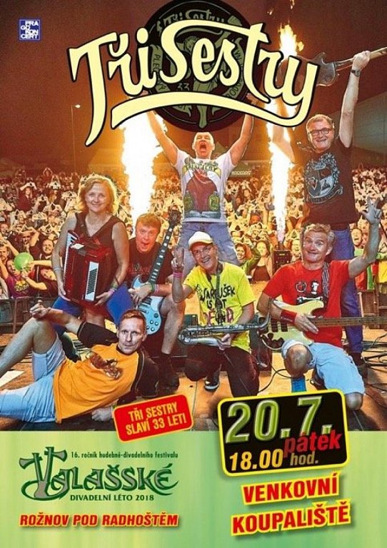 Skupina Tři sestry je dnes českou legendou, která i po třiatřiceti letech s velkým nadšením a ve vší pokoře objíždí naši krásnou českou kotlinu. A právě vy ji máte možnost vidět v rámci 16. ročníku Valašského divadelního léta 2018 v Rožnově pod Radhoštěm. Jako hosté zahrají E ! E, Doctor P. P. a Fancy Foxx.