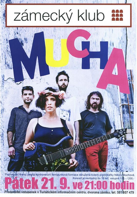 Mucha, brněnský hudební útvar hrající provokativní písně, tzv. femipunk, vystoupí v Hranicích v pátek 21. září od 21:00 hodin v Zámeckém klubu. Akce je vhodná pro mládež od 18 let.