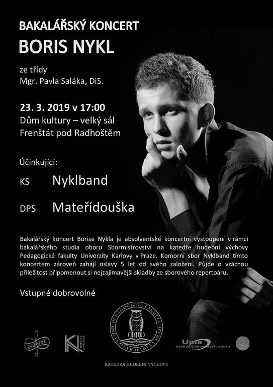 Bakalářský koncert Borise Nykla je absolventské koncertní vystoupení v rámci bakalářského studia oboru Sbormistrovství na katedře hudební výchovy Pedagogické fakulty Univerzity Karlovy v Praze. Komorní sbor Nyklband tímto koncertem zahájí oslavy 5 let od svého založení. Půjde o vzácnou příležitost připomenout si nejzajímavější skladby ze sborového repertoáru. Vstupné dobrovolné.