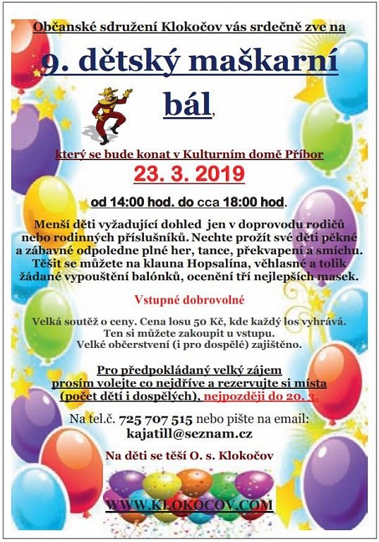 Nechte prožít své děti pěkné a zábavné odpoledne plné her, tance, překvapení a smíchu. Těšit se můžete na klauna Hopsalína, věhlasné a tolik žádané vypouštění balónků, ocenění tří nejlepších masek. Vstupné je dobrovolné. Menší děti vyžadující dohled jen v doprovodu rodičů nebo rodinných příslušníků. Občerstvení (i pro dospělé) zajištěno. Pro předpokládaný velký zájem volejte a rezervujte si místa (počet dětí i dospělých) nejpozději do 20. 3.