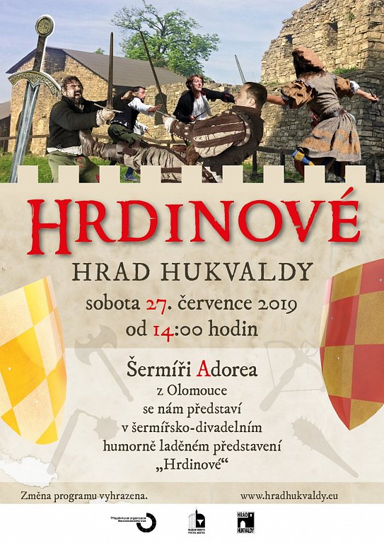 Šermíři Adorea z Olomouce se nám představí v šermířsko-divadelní humorně laděném představení "Hrdinové". Prožijte naživo legendární okamžiky hrdinů z románů, pohádek, divadel a filmů s množstvím hromadných akčních scén, kaskadérských výkonů a se zapojením diváků. Změna programu vyhrazena.