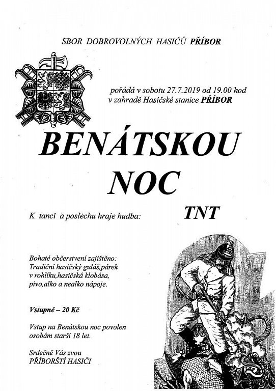 K tanci a poslechu hraje hudba TNT. Bohaté občerstvení zajištěno, tradiční hasičský guláš, párek v rohlíku, hasičská klobása, pivo, alko i nealko nápoje. Vstup na Benátskou noc povolen osobám starší 18 let.