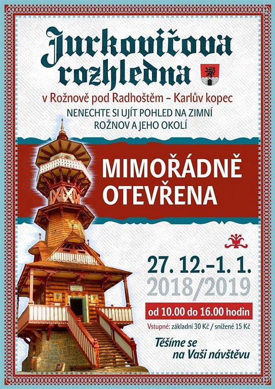 Rožnov pod Radhoštěm 30. 12. 2018 od 10:00 JURKOVIČOVA ROZHLEDNA