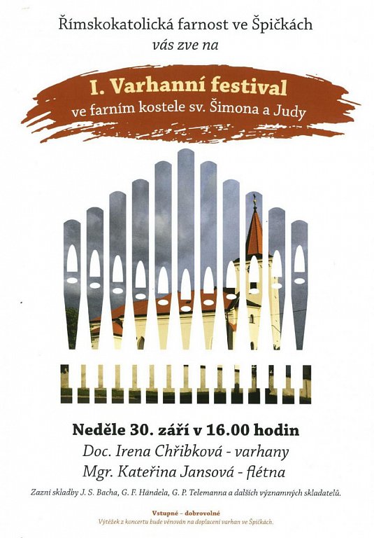 První varhanní festival ve Farním kostele sv. Šimona a Judy ve Špičkách se bude konat v neděli 30. září od 16:00 hodin. Na varhany se představí Doc. Irena Chřibková a na flétnu Mgr. Kateřina Jansová. Zazní skladby J. S. Bacha, G. F. Händela, G. P. Telemanna a dalších významných skladatelů. Vstupné je dobrovolné a výtěžek bude věnován na doplacení varhan ve Špičkách.