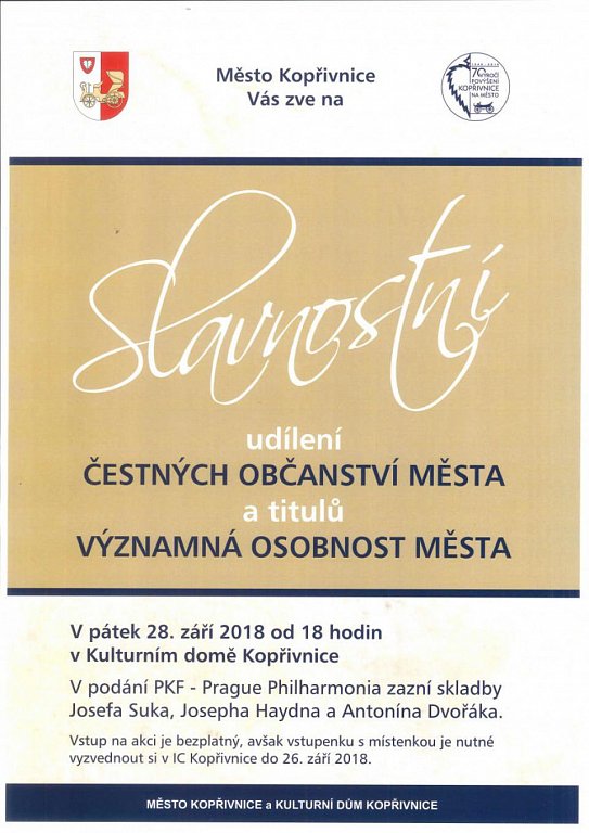 Kopřivnice 28. 9. 2018 od 18:00 SLAVNOSTNÍ VEČER K 70. VÝROČÍ POVÝŠENÍ KOPŘIVNICE NA MĚSTO