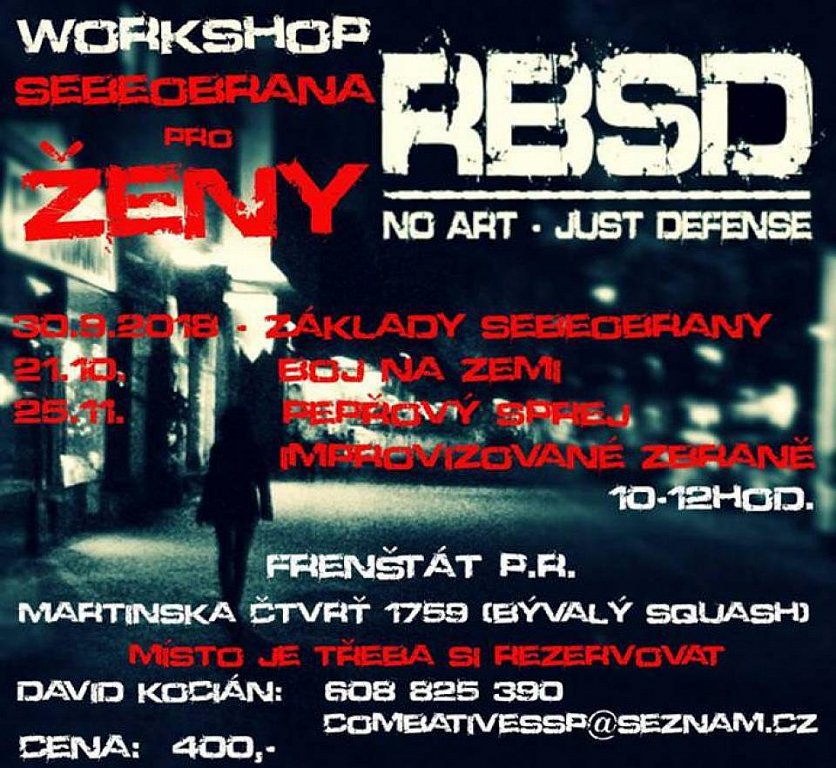 Základy sebeobrany pro ženy, instruktorem je David Kocián. Telefon: 608 825 390. Nutná rezervace.