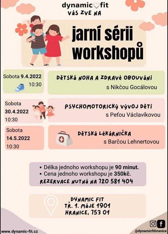 V sobotu 9. dubna 2022 se od 10:30 hodin bude konat workshop s názvem Psychosomatický vývoj dítěte s Petrou Václavíkovou v Dynamic fit Hranice. Cena je 350 Kč.