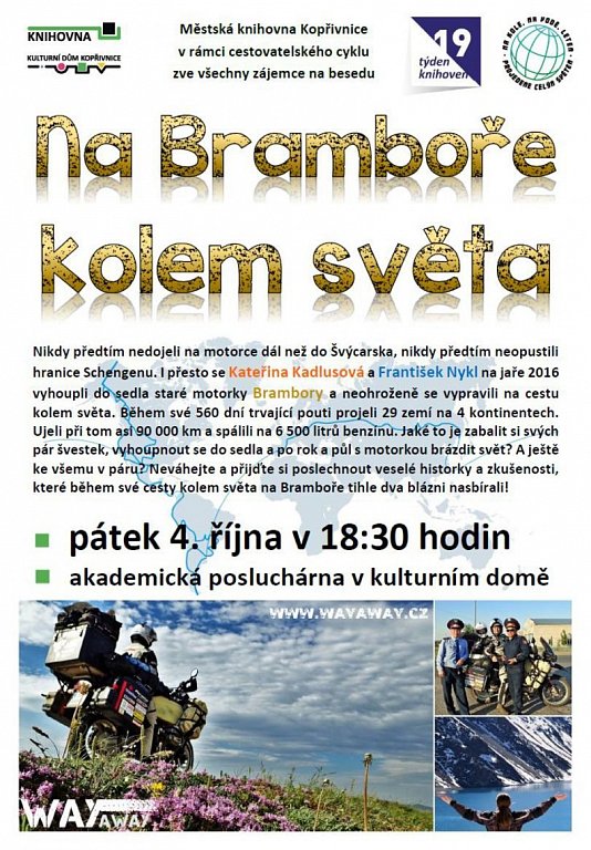 Nikdy předtím nedojeli na motorce dál než do Švýcarska, nikdy předtím neopustili hranice Schengenu. I přesto se Kateřina Kadlusová a František Nykl na jaře 2016 vyhoupli do sedla staré motorky Brambory a neohroženě se vypravili na cestu kolem světa. Během své 560 dní trvající pouti projeli 29 zemí na 4 kontinentech. Ujeli při tom asi 90 000 km a spálili na 6 500 litrů benzínu. Jaké to je zabalit si svých pár švestek, vyhoupnout se do sedla a po rok a půl s motorkou brázdit svět? A ještě ke všemu v páru? Neváhejte a přijďte si poslechnout veselé historky a zkušenosti, které během své cesty kolem světa na Bramboře tihle dva blázni nasbírali!