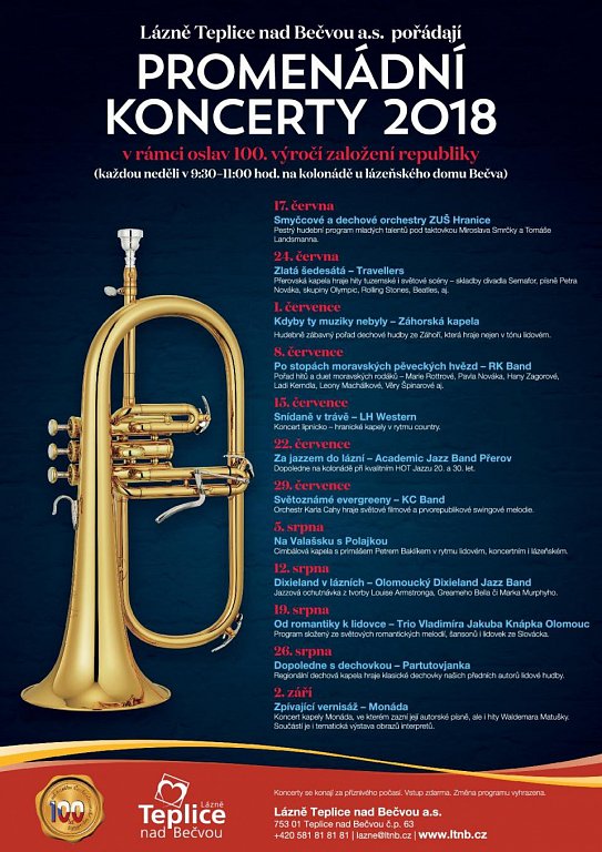 Promenádní koncerty v rámci oslav 100. výročí založení republiky se budou konat každou neděli od 9:30 do 11:00 hodin na kolonádě u lázeňského domu Bečva, a to až do neděle 2. září.