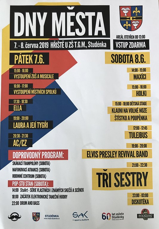 V roce 2019 slaví město 60. výročí vzniku, a právě proto jsme se rozhodli vůbec poprvé uspořádat Den města ve dvou dnech – v pátek 7. a sobotu 8. června 2019. V každém dni vystoupí interpreti, kteří ve Studénce svou kariéru začínali, nebo jsou teprve na jejím počátku.