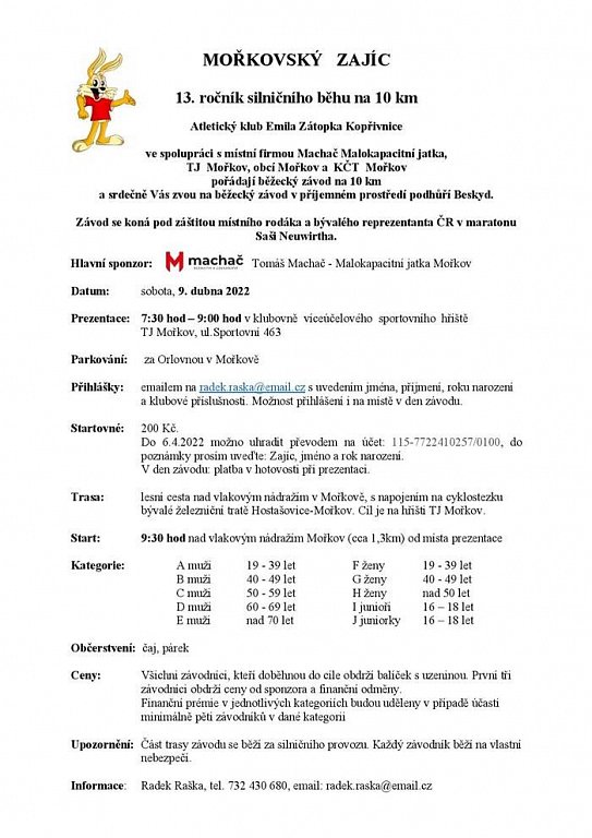 Prezentace 7:30 -9:00 v klubovně víceúčelového sportovního hřiště TJ Mořkov, ul. Sportovní 463.