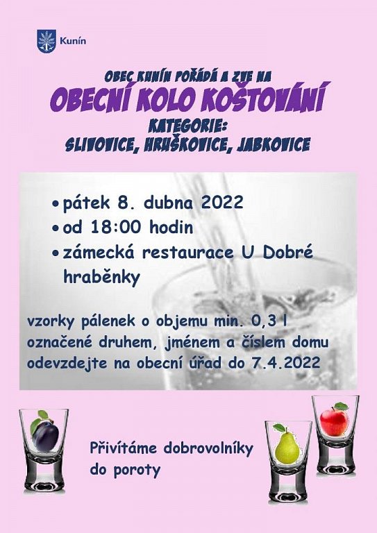 Vzorky pálenek o objemu min. 0,3 l označené jménem a číslem domu přihlašujte a přinášejte na obecní úřad do 7. 4. 2022. Vítězové z každé kategorie postoupí do regionálního kola koštování v Bartošovicích.