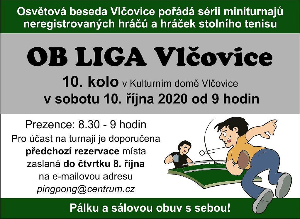Pro účast na turnaji je doporučena předchozí rezervace místa zaslaná do čtvrtku 24. září na emailovou adresu pingpong@centrum.cz