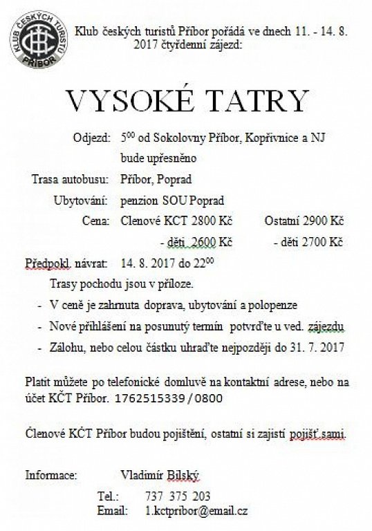 Příbor 11. 8. 2017 – 14. 8. 2017 od 5:00 VYSOKÉ TATRY