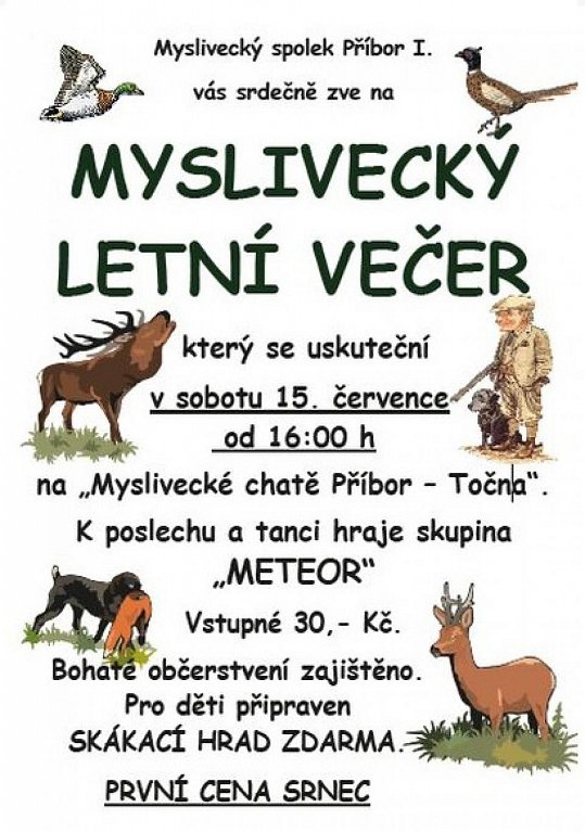 Myslivecké sdružení Příbor zve všechny na myslivecký večer. K poslechu a tanci hraje skupina Meteor. Bohaté občerstvení zajištěno. Pro děti připraven skákací hrad zdarma. První cena srnec.