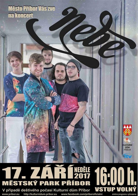 16.00 hod. v městském parku Příbor, koncert hudební skupiny NEBE. Vstup zdarma.