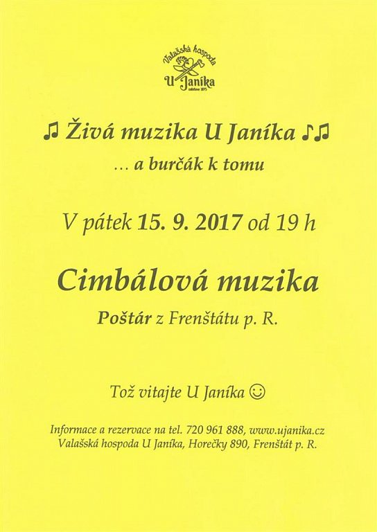 Frenštát pod Radhoštěm 15. 9. 2017 v 19:00 ŽIVÁ MUZIKA U JANÍKA A BURČÁK K TOMU
