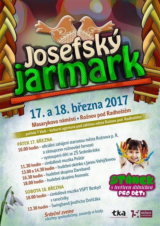 Tradiční Josefský jarmark pořádá v pátek 17. 3. a v sobotu 18. 3. na Masarykově náměstí v Rožnově pod Radhoštěm T klub - kulturní agentura, příspěvková organizace pod záštitou města Rožnova pod Radhoštěm.