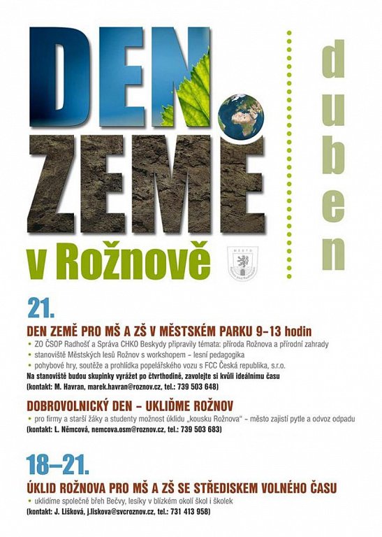 8.00 – 13.00 hodin – Rožnov a okolí. Různé aktivity se zaměřením na ekologii, ochranu životního prostředí a přírodu obecně. Do úklidu se mohou připojit firmy, školy, jednotlivci. Stačí si vybrat aktivitu a přidat se…