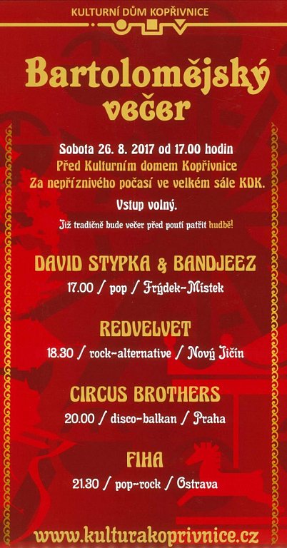 Kopřivnice 26. 8. 2017 od 17:00 BARTOLOMĚJSKÝ VEČER