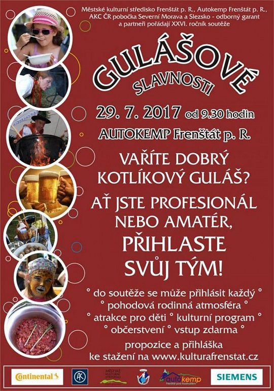 Již 24. ročník tradiční soutěže o nejlepší kotlíkový guláš. Čekají vás nejen voňavé guláše, speciality na grilu, chlazené pivo, míchané nápoje, ale i bohatý kulturní program. Pro děti je připraveno hřiště, skákací hrad a další atrakce. Přihlášku do soutěže si můžete vyzvednout v kanceláři DK, nebo z www.kulturafrenstat.cz.