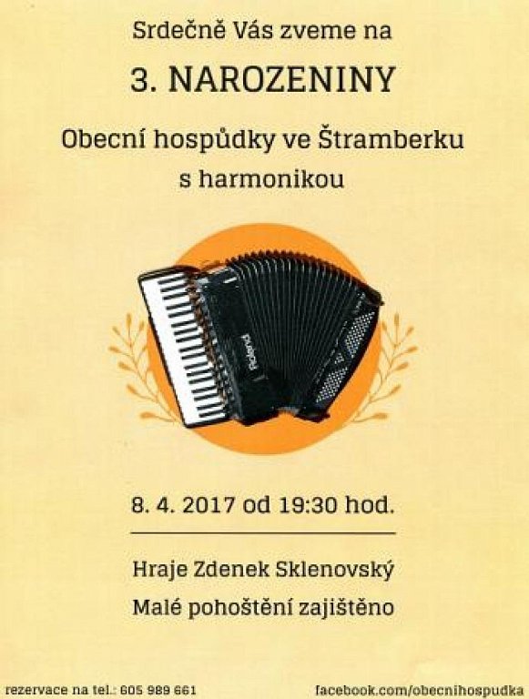 Obecní hospůdka ve Štramberku zve všechny na oslavu svých 3. narozenin s harmonikou. Zahraje Zdenek Sklenovský. Malé občerstvení zajištěno.