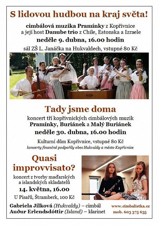 Obec Hukvaldy zve všechny příznivce cimbálové muziky na vystoupení skupiny Pramínky z Kopřivnice a jejího hosta Danube trio z Chile, Estonska a Izraele.