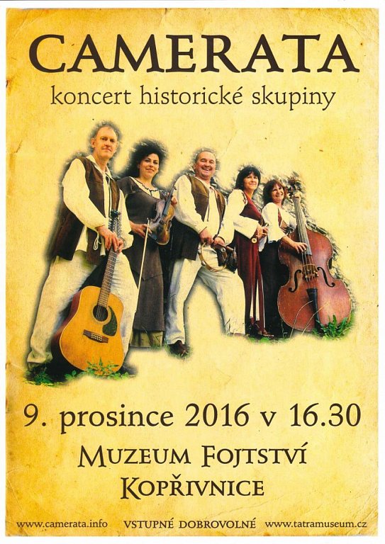 Muzeum Fojtství zve všechny příznivce hudby na koncert historické skupiny Camerata. Koncert bude zaměřen na vánoční koledy a vánoční písně české i zahraniční. Součástí vystoupení je průvodní slovo, zahrnující jak historická fakta související s adventem a Vánoci, tak zajímavosti o jednotlivých skladbách a období, ze kterého pocházejí. Součásti koncertu bude vystoupení flétnového souboru První SZUŠ MIS music pod vedením p.uč. Lenky Štirbové.