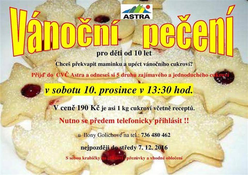 Sobotní odpoledne provoní Astru vánoční cukroví, které si sem mohou přijít upéct děti ve věku od 10 let. V ceně 190 Kč jsou zahrnuty suroviny, energie a ped.dozor. Děti si odnesou 1 kg vlastnoručně upečeného cukroví. Na akci je nutné se předem přihlásit. Více info: I. Golichová, tel.: 736 480 462, email: golichova@astrafren.cz