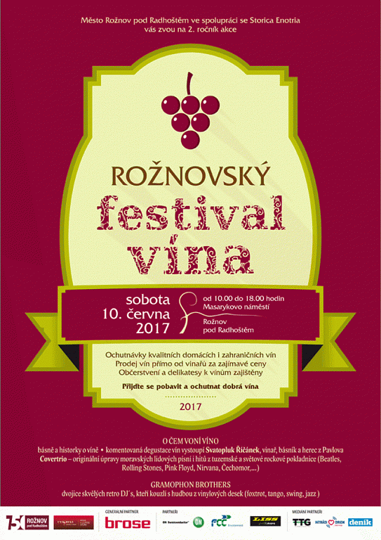 Rožnov Pod Radhoštěm 10. 6. 2017 od 10:00 do 18:00 ROŽNOVSKÝ FESTIVAL VÍNA