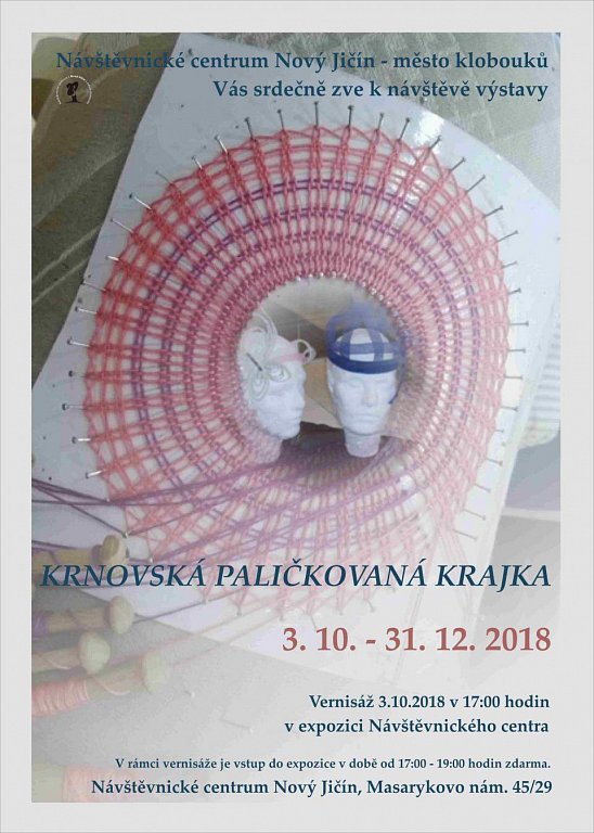 Návštěvnické centrum Nový Jičín zve na výstavu s názvem KRNOVSKÁ PALIČKOVANÁ KRAJKA a na výstavu fotografií s názvem PORTRÉTY LIDSKÝCH TVÁŘÍ A ŽIVOT HORALŮ od Jana Kufy Kičeřoka.