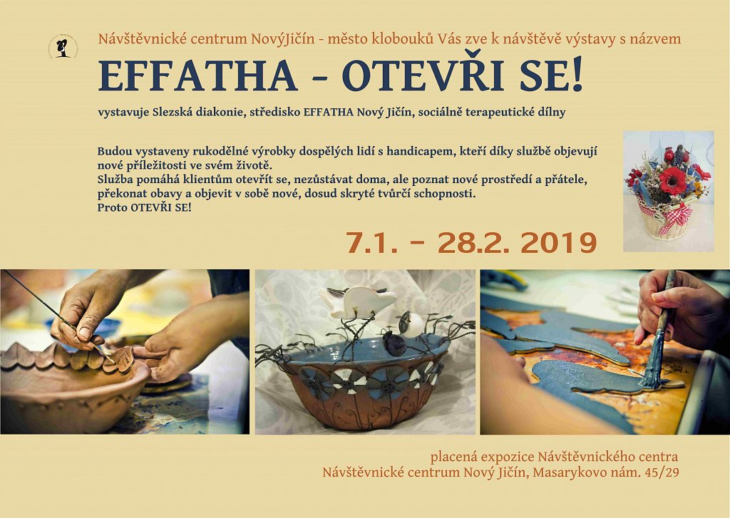 Úterý 8. ledna 2019 – Čtvrtek 28. února 2019 - placená expozice klobouků Návštěvnického centra - výstava s názvem EFFATHA – OTEVŘI SE! Budeme vystavovat rukodělné výrobky dospělých lidí s handicapem, kteří díky službě objevují nové příležitosti ve svém životě. Služba pomáhá klientům otevřít se, nezůstávat doma, ale poznat nové prostředí a přátele, překonat obavy a objevit v sobě nové, dosud skryté tvůrčí schopnosti. Proto OTEVŘI SE ! Vystavuje Slezská diakonie, středisko EFFATHA Nový Jičín, sociálně terapeutické dílny.