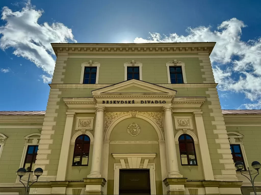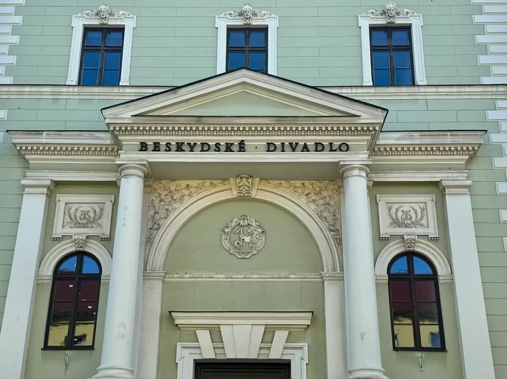 A stucco relief emblem on the facade of the former German House, now the Beskydy Theatre.